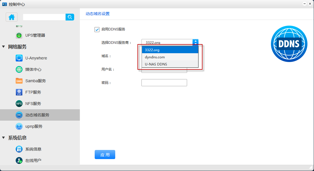U-NAS 内建支持两种 DDNS 服务提供商:www.3322.org , www.dyndns.com ,以及后期万由自己搭建的 DDNS 服务器 U-NAS DDNS。