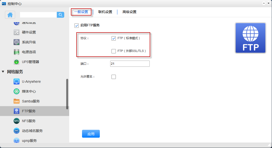 启用 FTP 服务,用户可以通过在浏览器的地址栏内输入 ftp://IP 或者使用 FTP 工具访问 U-NAS 上的文件。