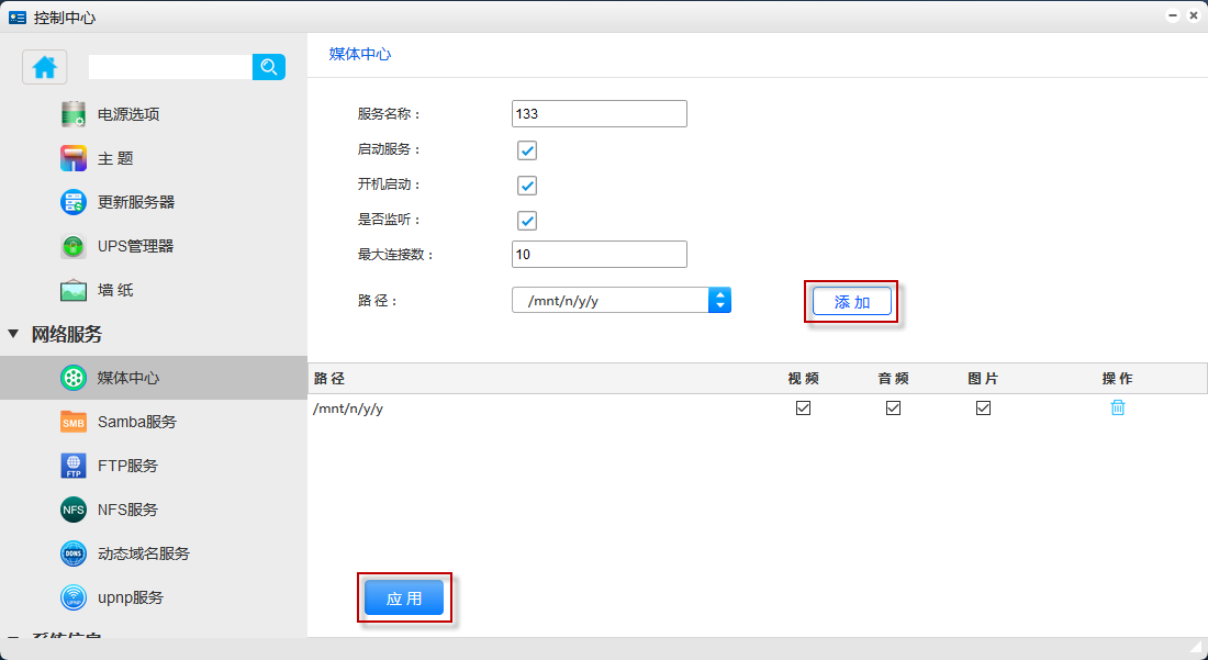 服务名称可自己命名,最大连接数指的是允许通过 u-media 手持端连接的最大数,路径是存放影音文件的共享文件夹