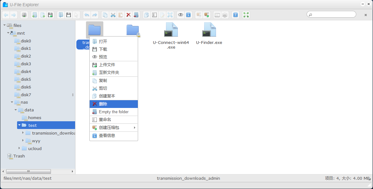 U-NAS 5.0 集成了 U-File Explorer,一个 Web 文件管理工具,U-NAS 用户可以使用 Web 浏览器访问 NAS 上的文件夹。 通过挂载网络卷可以挂载多台服务器,通过简单的拖放操作即可管理服务器上的数据