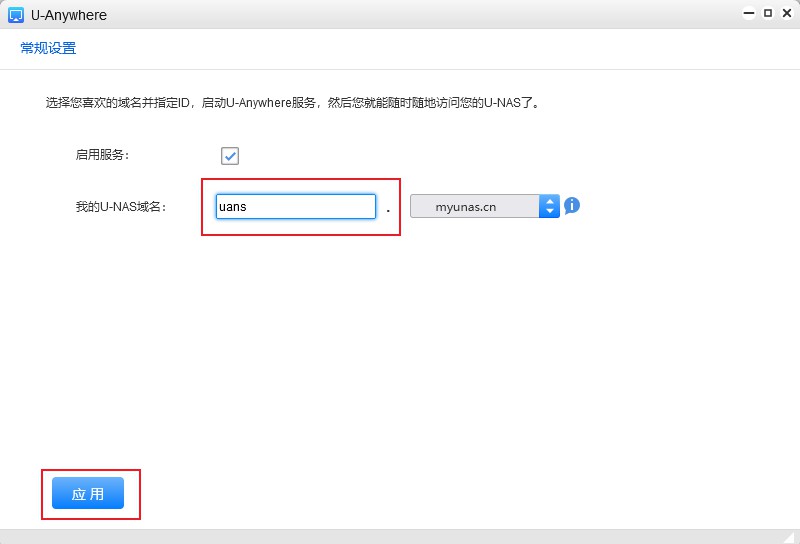 设置U-Anywhere ID,选择对应的域名,并点击“应用”