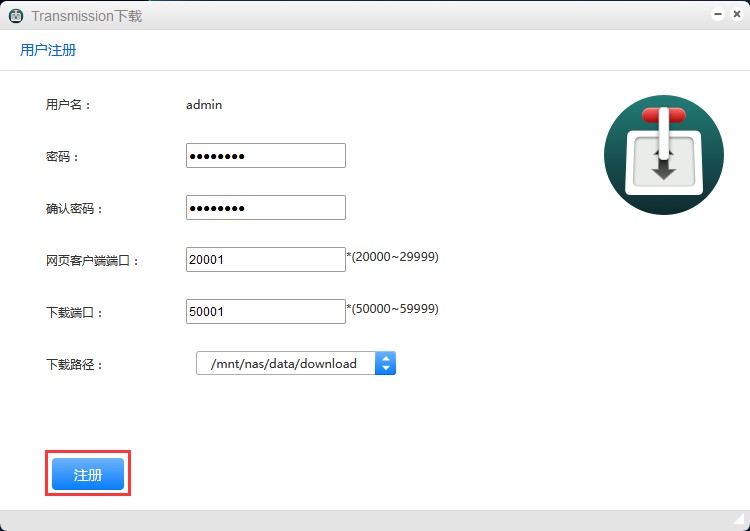 点击启动进入web管理界面,输入用户名和密码,点击“确定”,进入transmission客户端界面
