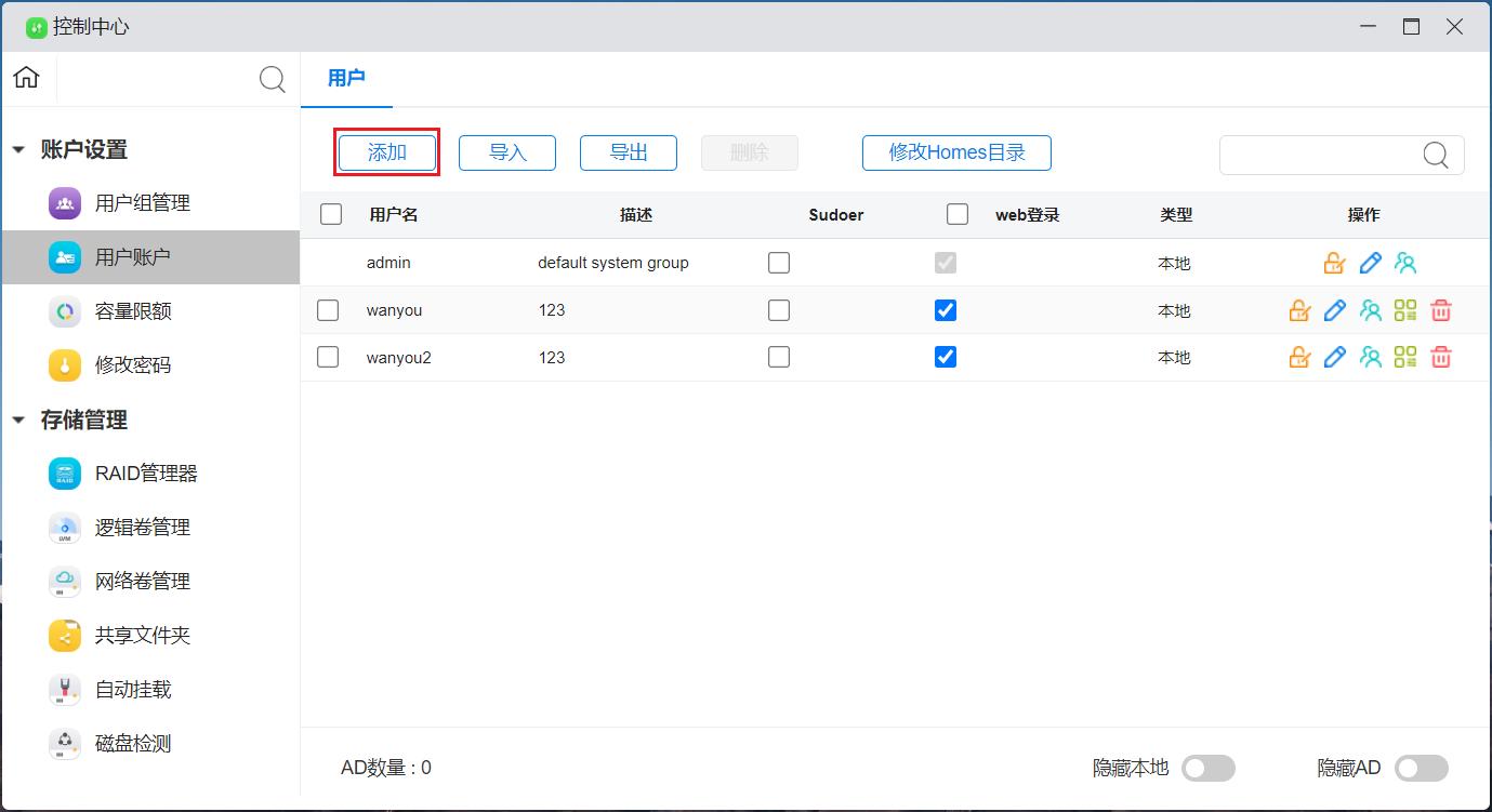 通过账户权限,可以统一处理NAS上的所有用户组/用户。用户可以创建、导入、删除用户,修改用户密码,修改所属组和组内用户,修改用户组/用户可以访问的APP,还可以设置用户组/用户在NAS上可以使用的容量配额。