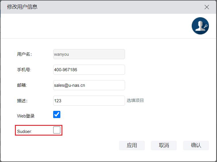 指定用户账号、手机号、邮箱、密码、描述信息,并初始化用户所属组,设置是否允许登入Web管理界面,以及是否要设置为Sudoer用户,设置完成后点击“确定”