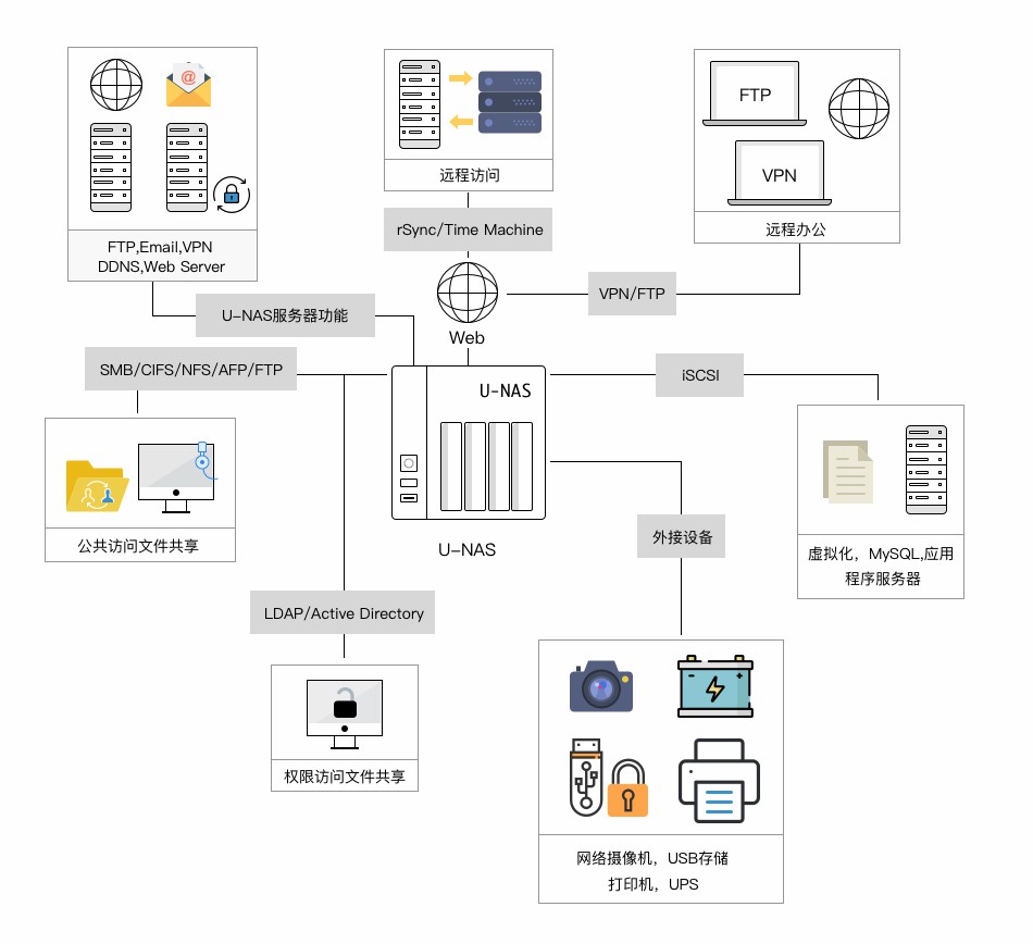 U-NAS可以共享文件到Windows、Mac、Linux等不同操作系统,支持多种文件协议:Samba/CIFS、FTP、NFS、AFP、WebDAV、NFS。