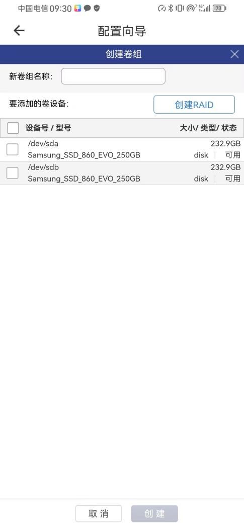 点击创建卷组,可以创建RAID设备,也可以直接选中硬盘,点击“下一步”,这里选择创建RAID,RAID创建完成后,选中RAID,点击“下一步”