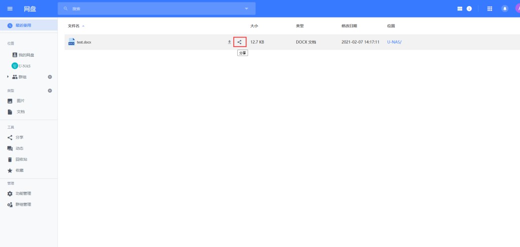 选择个人网盘/U-NAS 文件夹(U-NAS 文件夹下存放的文件可以相互协作,个人网盘只能自己看到)