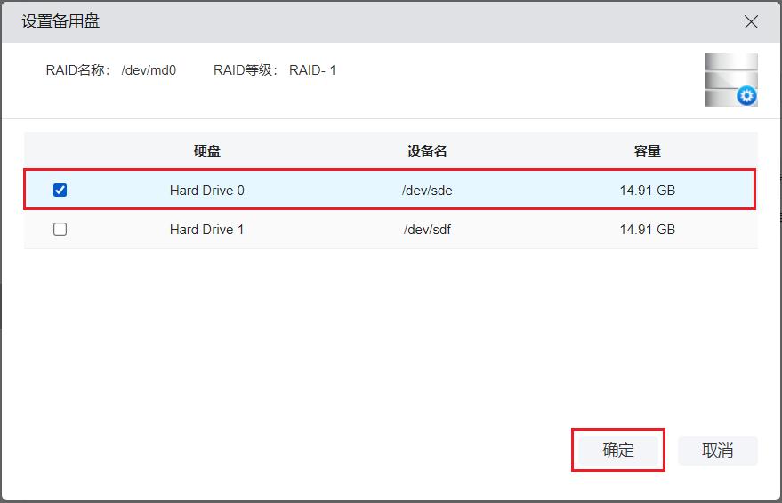 把新的硬盘接入到设备里,在RAID管理器界面,点击“设置备用盘”,可以看到我们刚才接入的那块硬盘,选中硬盘后,点击“确定”,新加入的硬盘就设置成热备盘了,当RAID设备缺少硬盘的时候,热备盘会自动加入到RAID设备,并开始重新同步