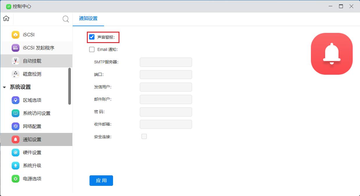 为了及时监督UNAS的使用安全,用户可以在通知设置下开启声音报警、邮件报警。