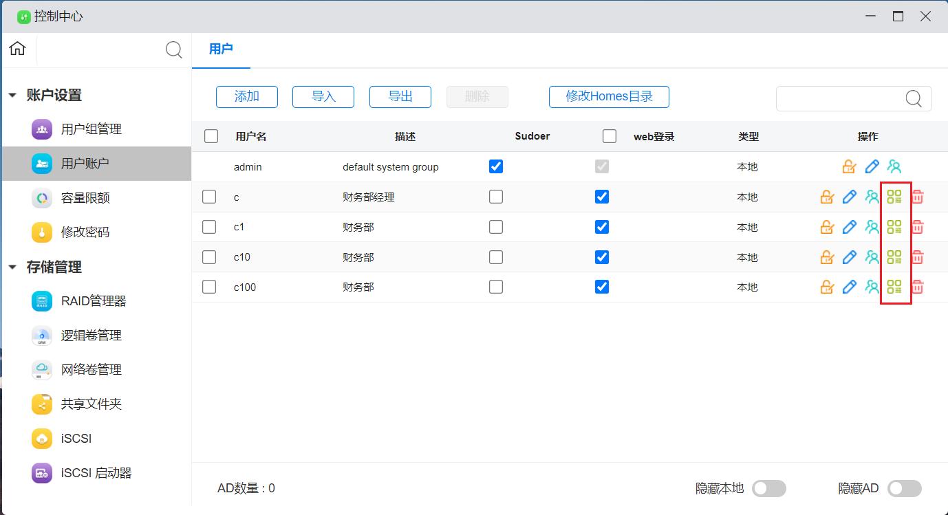 在此部分可以管理所有账户信息,可新建用户,删除用户,修改用户所属组,修改用户密码等等